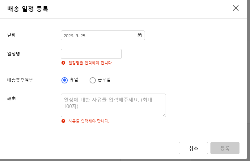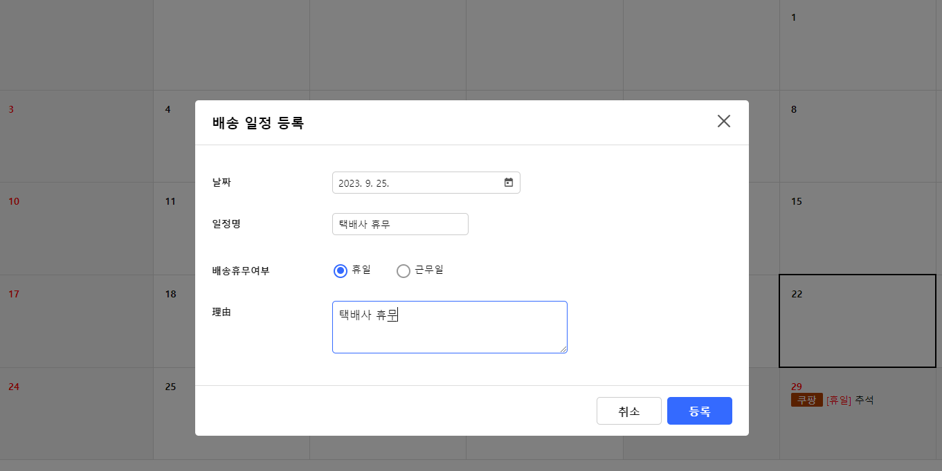 위와 같이 배송일정 등록이라는 팝업이 뜹니다.