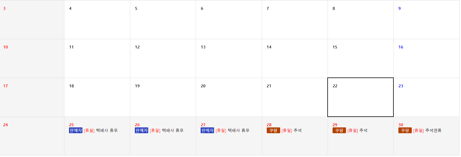 위와 같이 달력에 판매자가 설정한 휴무일이