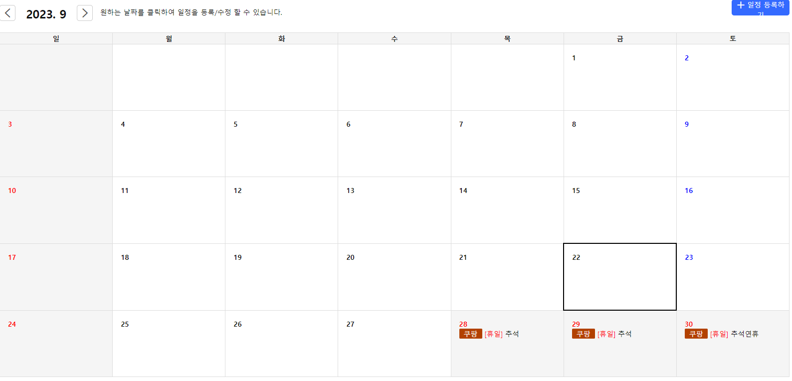 배송달력 관리를 선택하시면 위와 같이 달력이 나오게 되는데요.